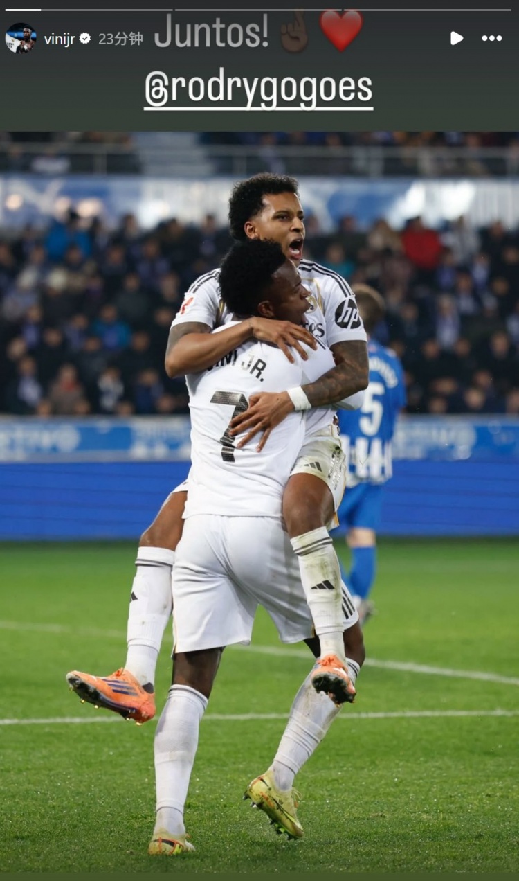 本场比赛维尼修斯助攻罗德里戈破门,赛后维尼修斯也在个人社媒晒出两人相拥庆祝的照片,配文写道:“一起面对!”