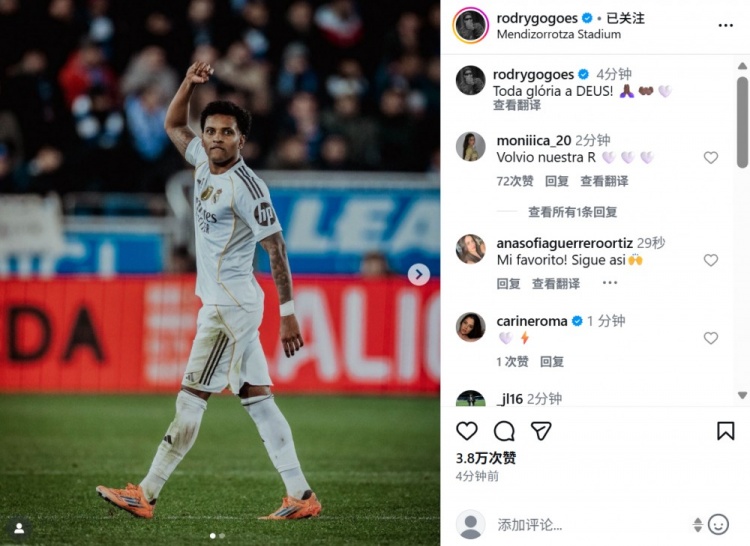 这也是罗德里戈自今年1月首次在西甲破门,赛后他也在个人社媒晒出本场照片,配文写道:“荣耀归于上帝!”